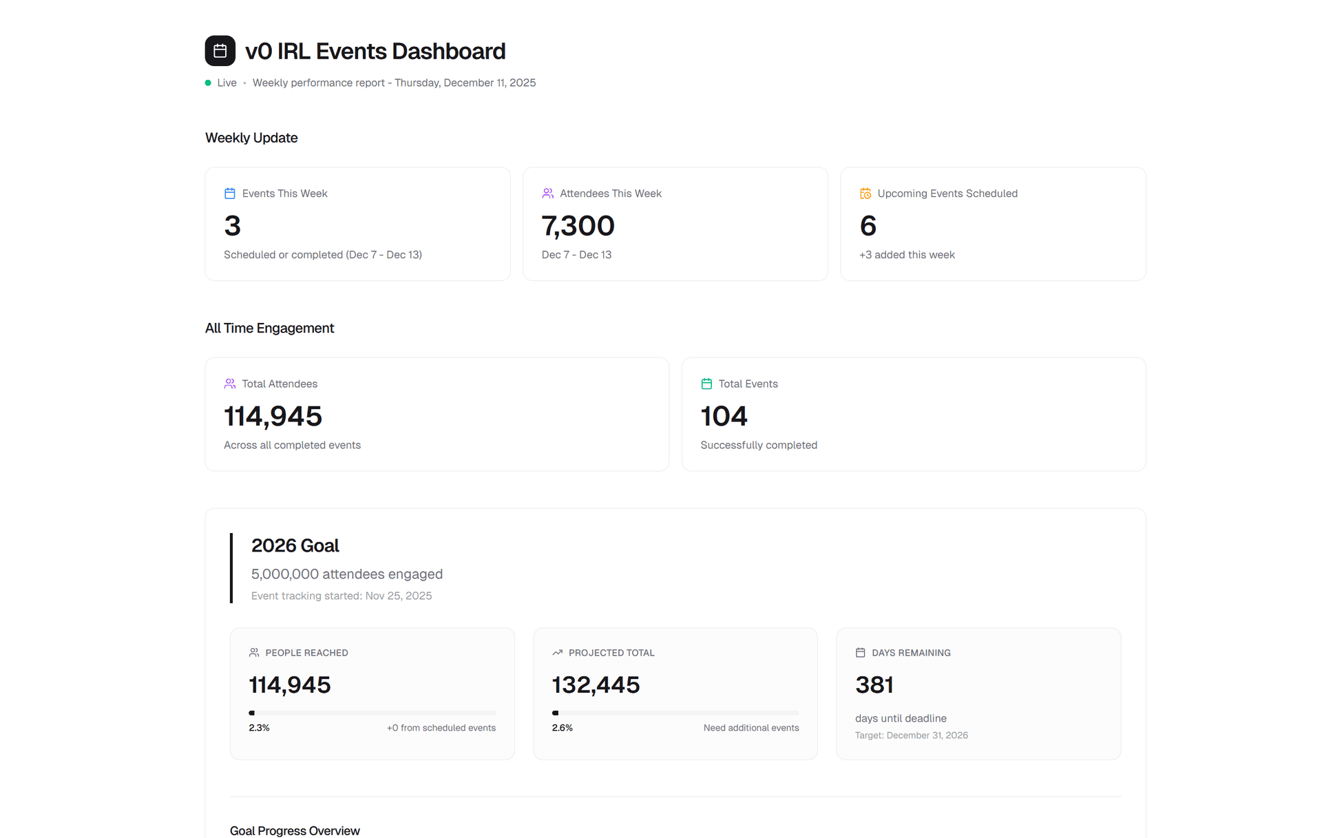 And with write access, v0 didn’t just generate the dashboard. It also wrote the weekly summary and key metrics directly back into our Notion events page.