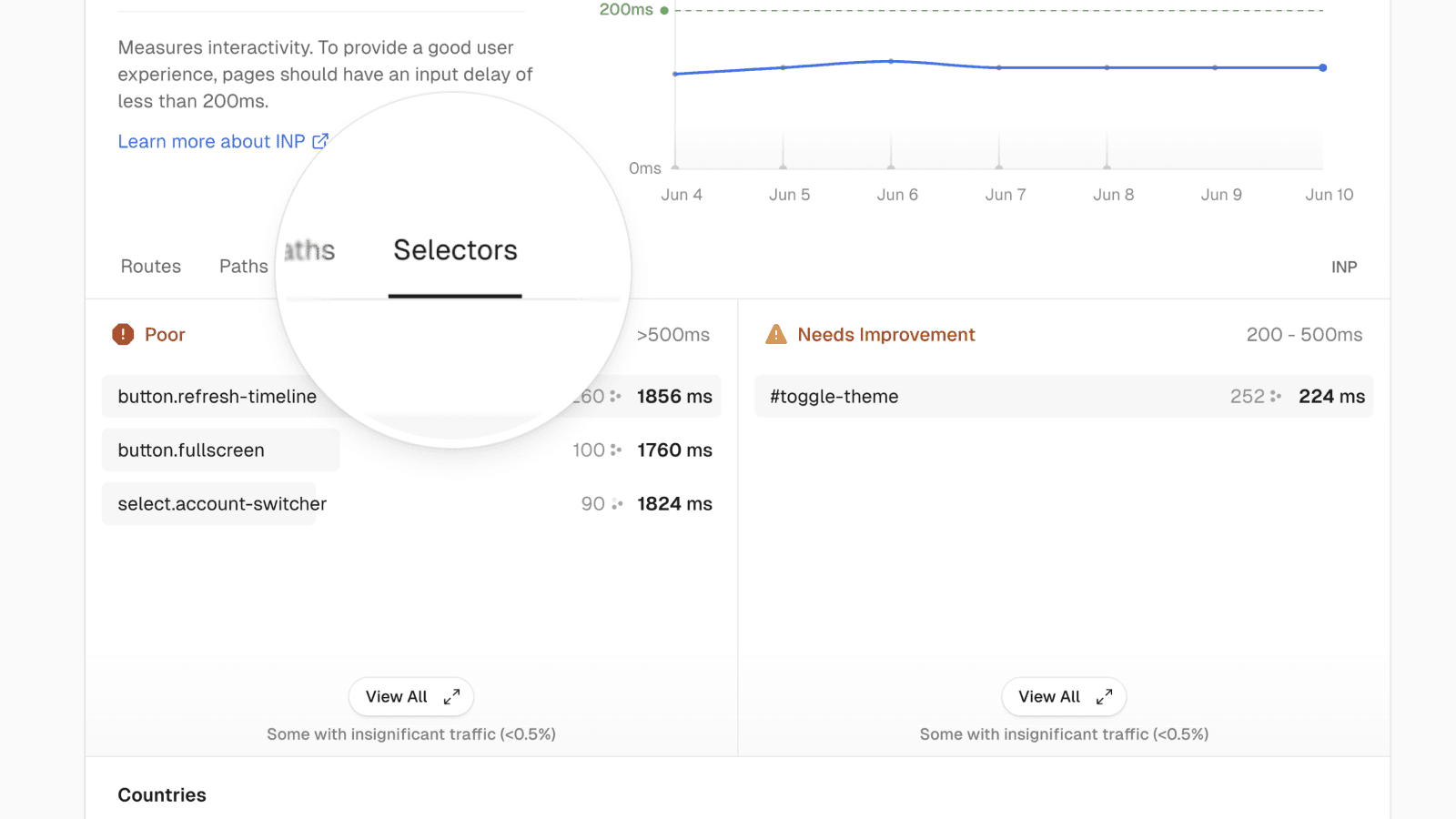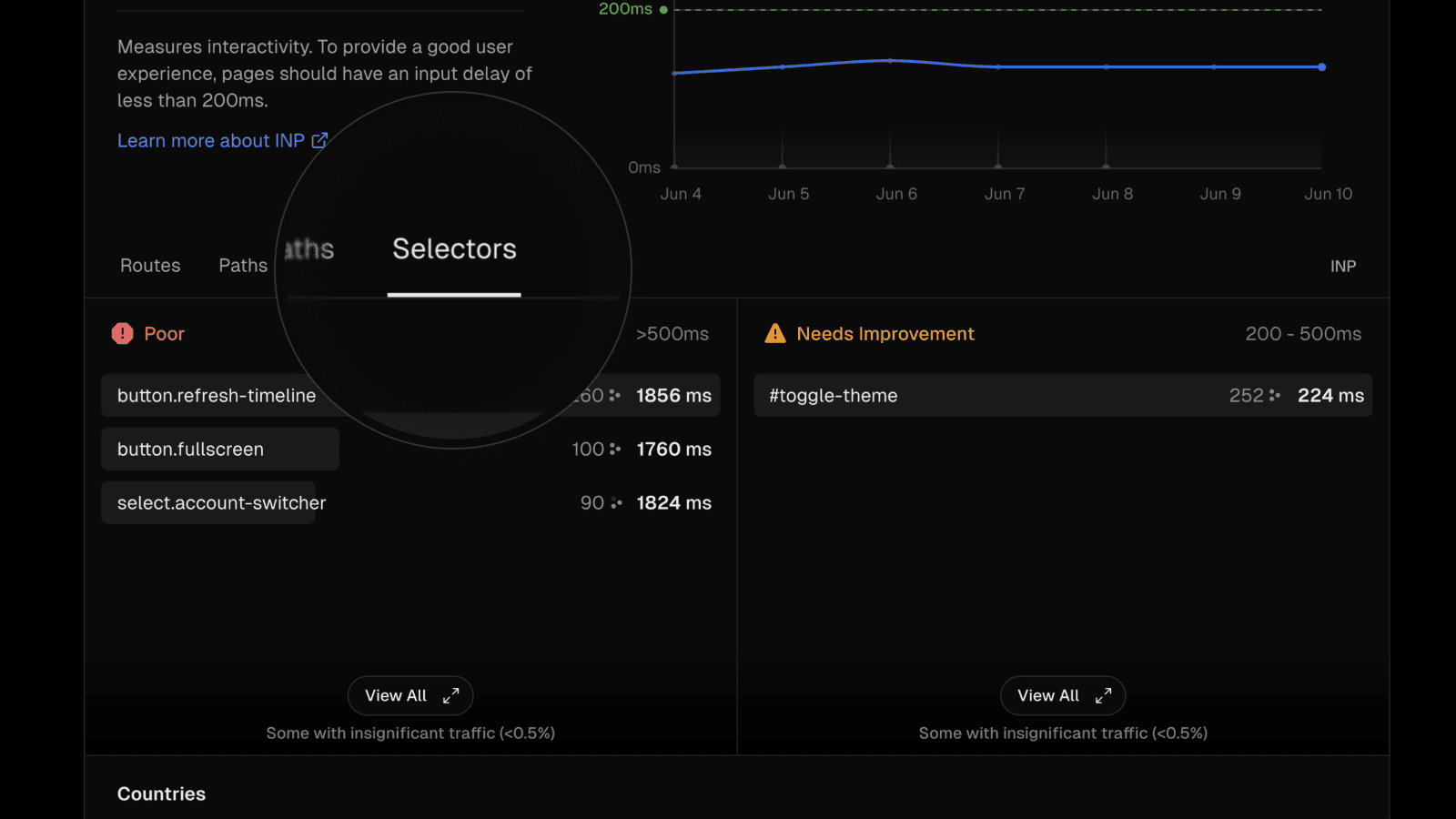 First, Vercel Speed Insights identifies the specific HTML elements impacting your Interaction to Next Paint (INP) metric. These CSS selectors tell you exactly which elements on the page had slow interactions. When optimizing INP, go through this list by frequency prioritizing the most frequent interactions that are slow or need improvement.