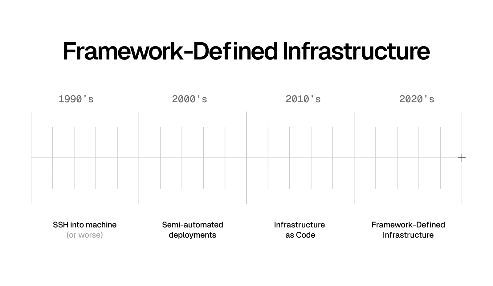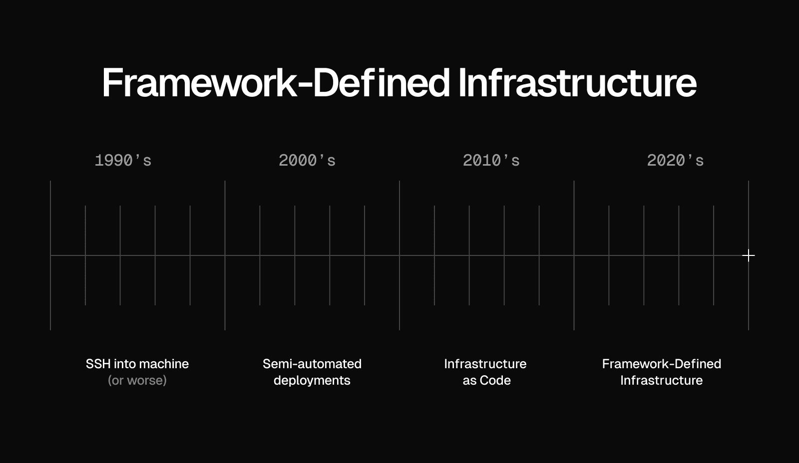 Vercel's frontend cloud, for example, uses Framework Defined Infrastructure to generate and manage infrastructure outputs without any developer intervention. This abstraction frees developers from infrastructure concerns, allowing them to focus on innovation, differentiated user experiences, and for the first time, consistently achieve all six core principles of application delivery: speed, global presence, scalability, dynamism, reliability, and security.