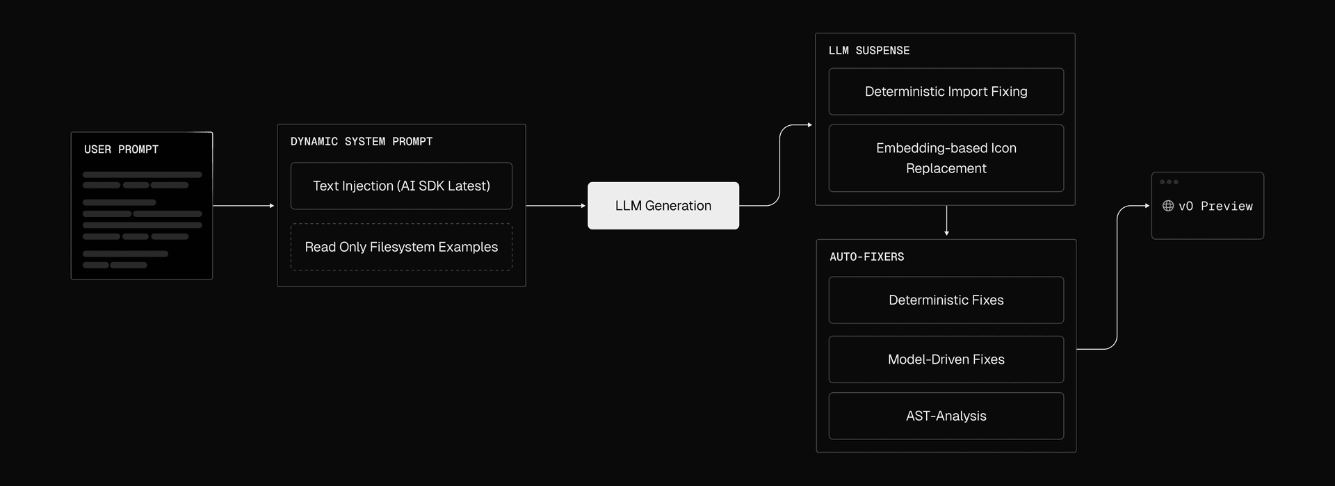 Last year we introduced the v0 Composite Model Family, and described how the v0 models operate inside a multi-step agentic pipeline. Three parts of that pipeline have had the greatest impact on reliability. These are the dynamic system prompt, a streaming manipulation layer that we call “LLM Suspense”, and a set of deterministic and model-driven autofixers that run after (or while!) the model finishes streaming its response.
