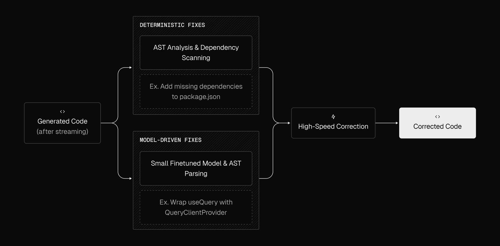 For these cases, we collect errors after streaming and pass them through our autofixers. These include deterministic fixes and a small, fast, fine tuned model trained on data from a large volume of real generations.