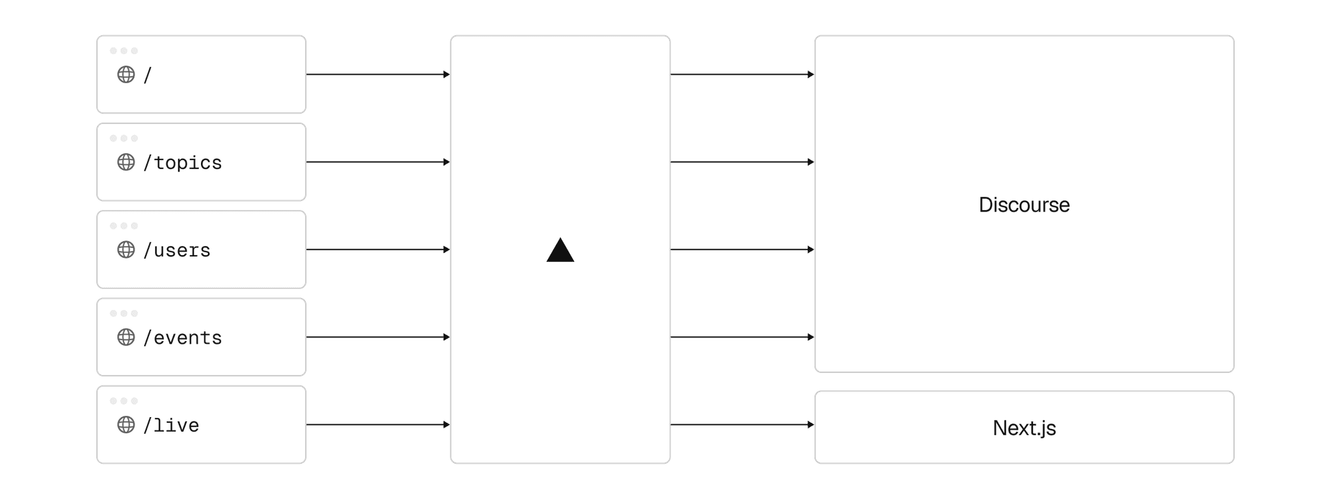 Some parts of the community platform, like Vercel Community live sessions, run directly on Vercel with Next.js. We use Vercel Microfrontends to mount a Next.js app on the same domain as the Discourse app, for three reasons: