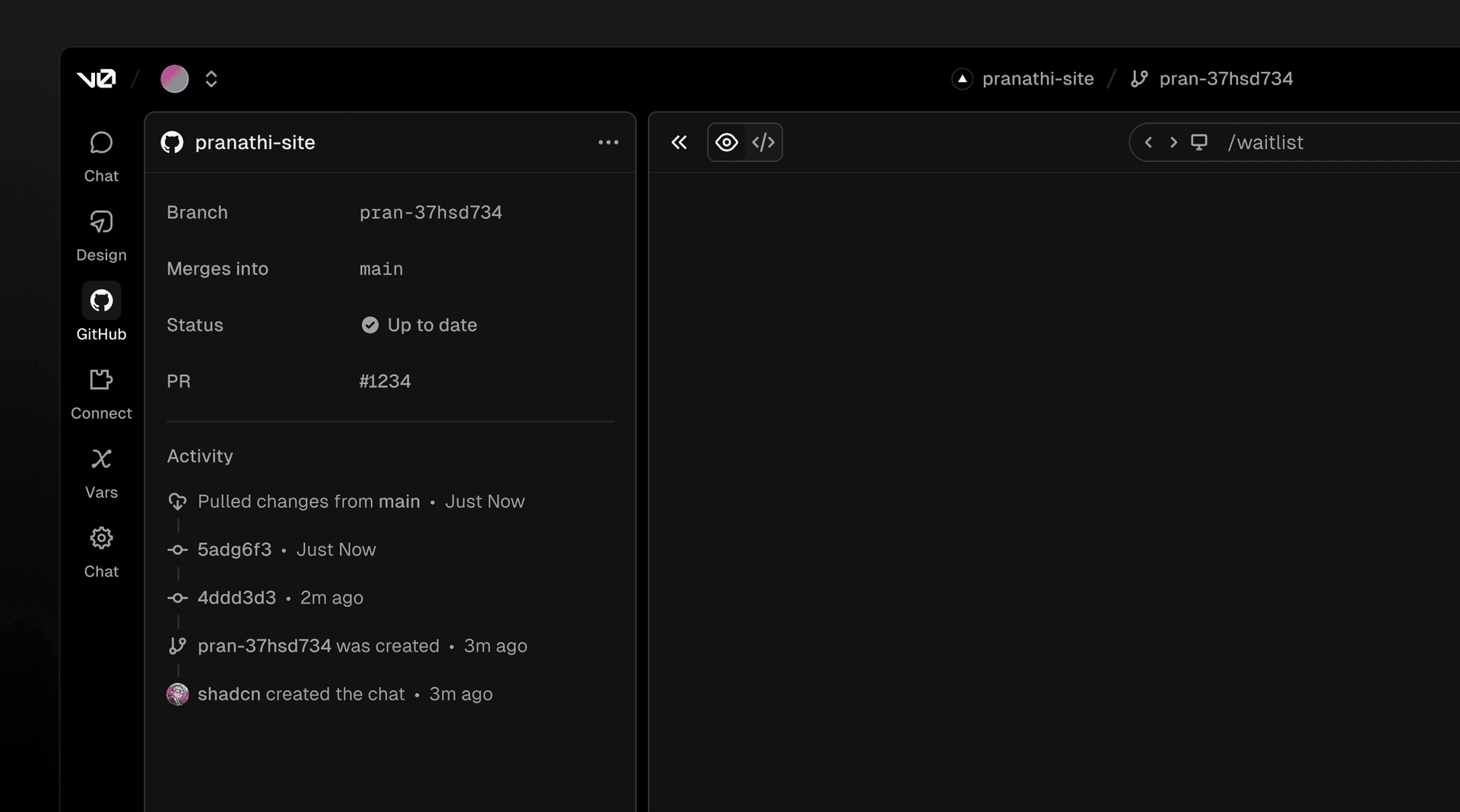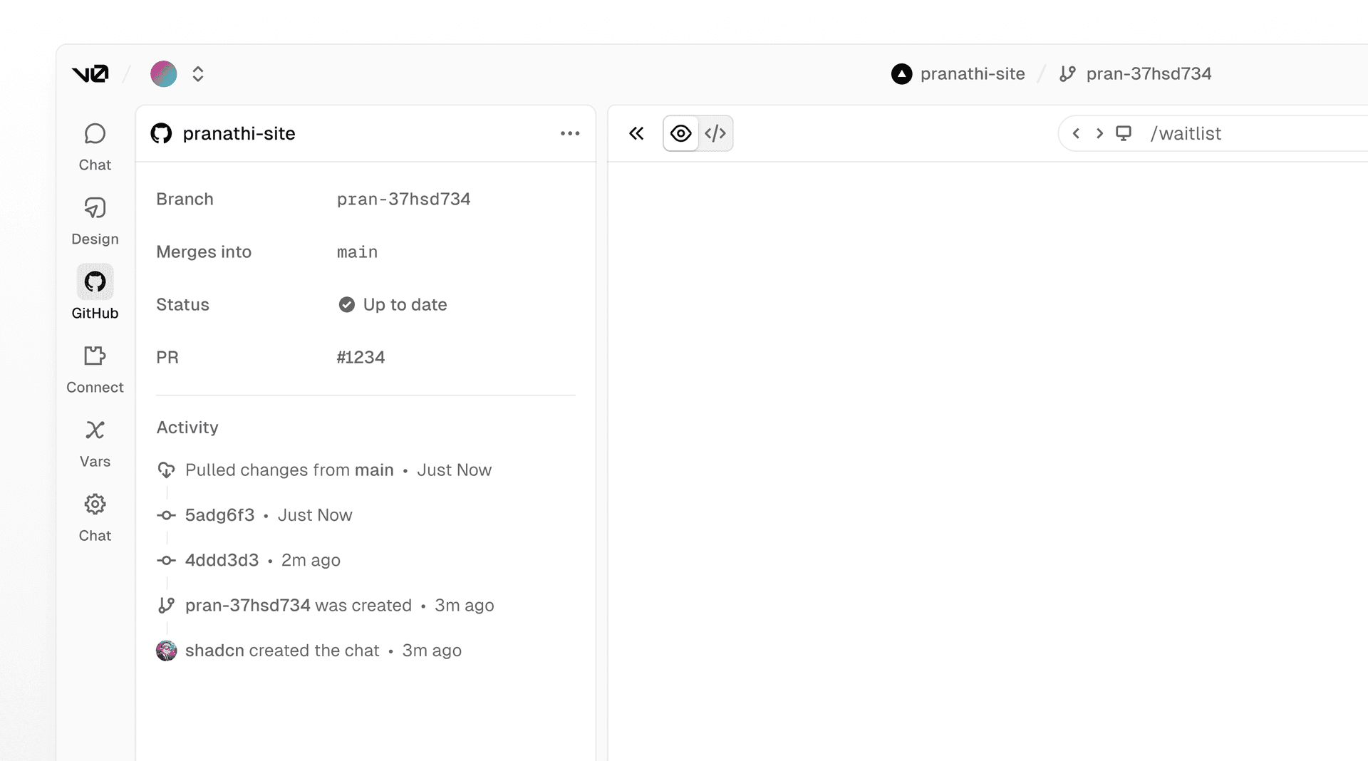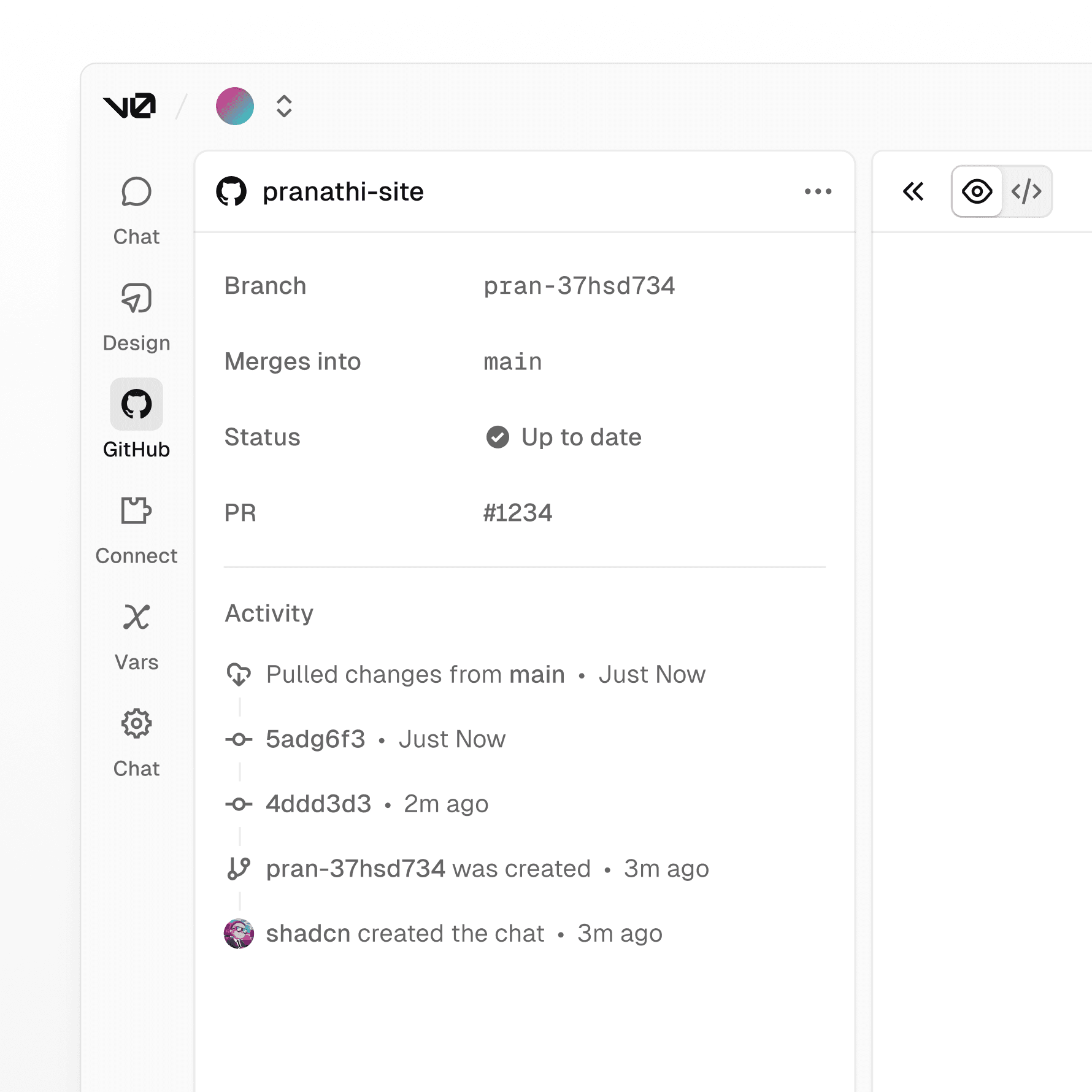 A new Git panel lets you create a new branch for each chat, open PRs against main, and deploy on merge. Pull requests are first-class and previews map to real deployments. For the first time, anyone on a team, not just engineers, can ship production code through proper git workflows.