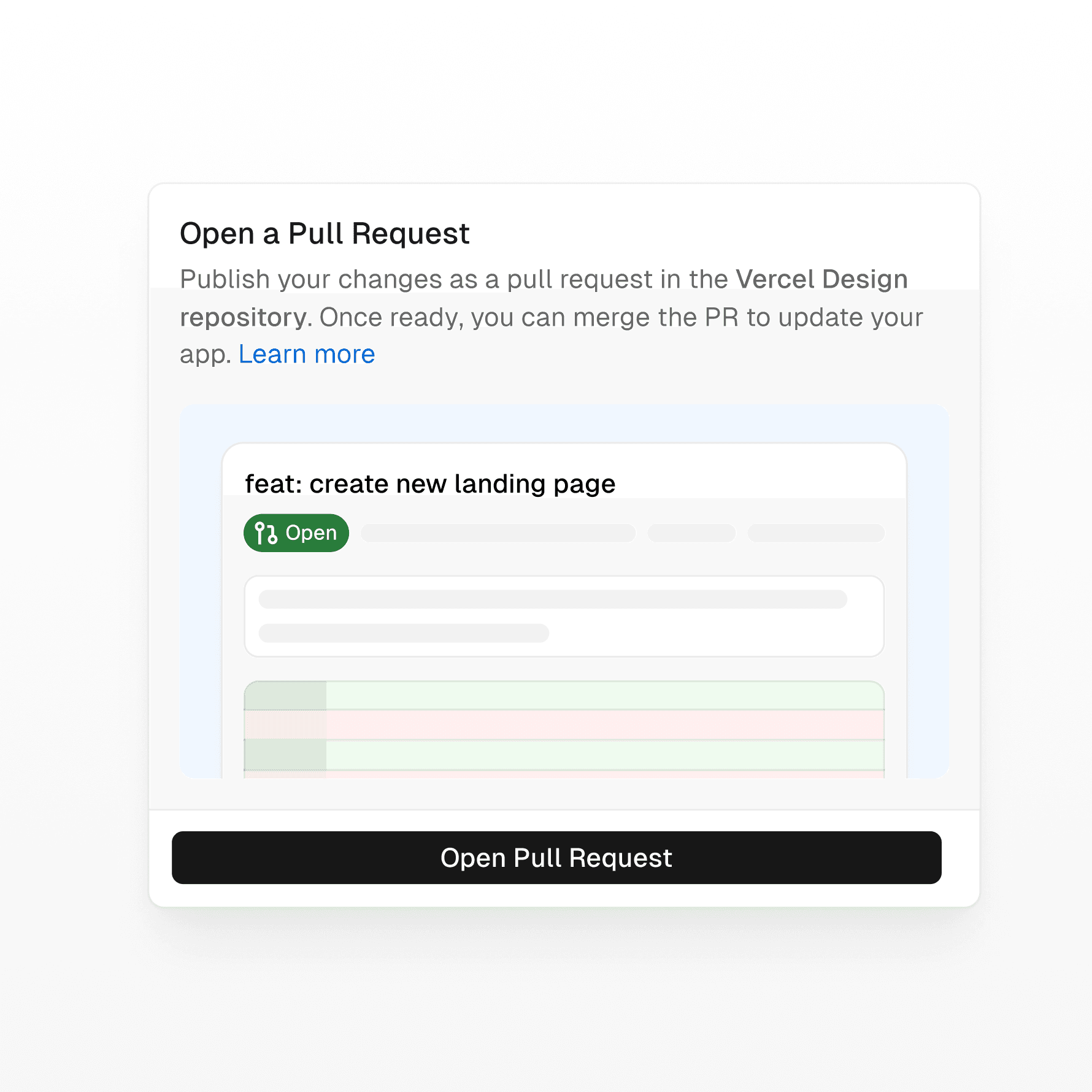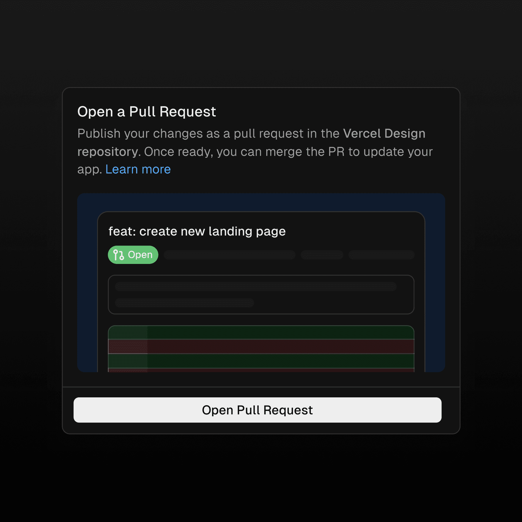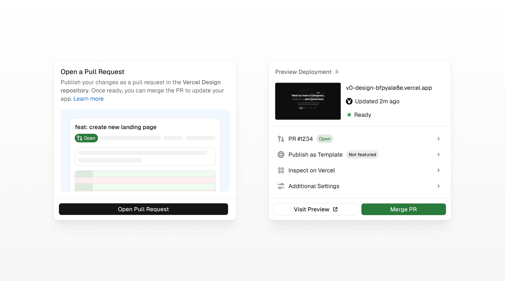 A new Git panel lets you create a new branch for each chat, open PRs against main, and deploy on merge. Pull requests are first-class and previews map to real deployments. For the first time, anyone on a team, not just engineers, can ship production code through proper git workflows.