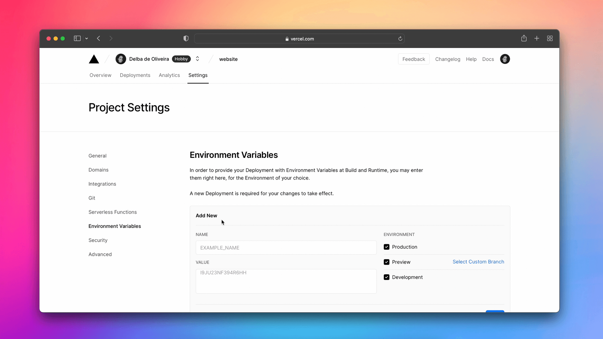 On Vercel, you can easily enhance your workflow from local machine into the cloud without using an external tool or building custom infrastructure to manage your secrets. Environment variables can be configured in your project settings on the Vercel dashboard.