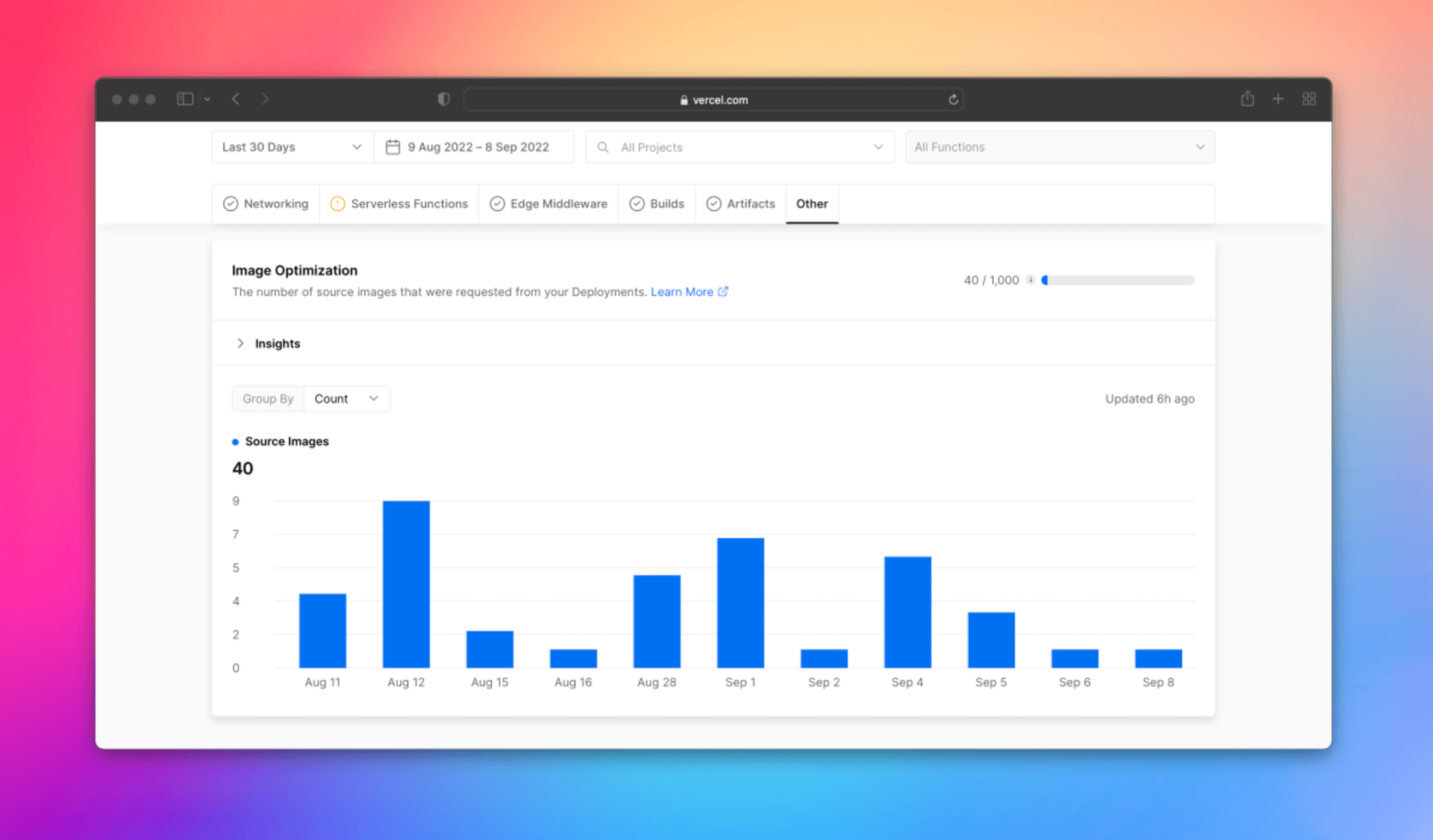 Furthermore, you can monitor the impact of your images with Vercel’s Usage tab. This will provide you with the insight to take any actions to optimize your images or let you know if any large image files are consuming too much bandwidth.