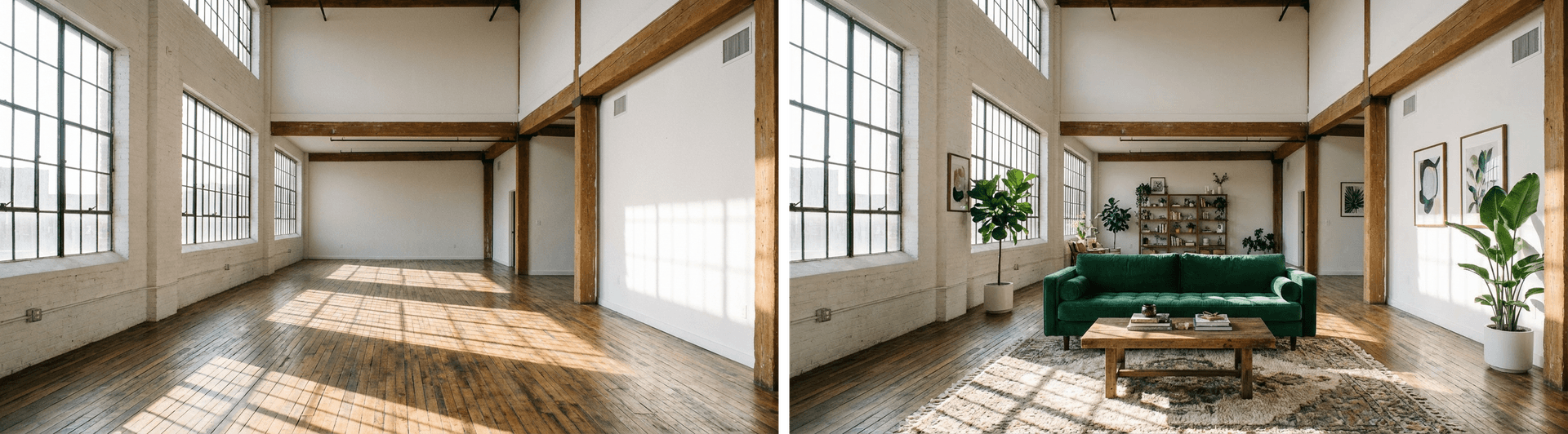 const { videos } = await generateVideo({ model: 'klingai/kling-v3.0-i2v', prompt: { image: startFrameDataUrl, // Empty room text: `Smooth cinematic transition: The empty loft fills with furniture. A green velvet sofa fades into view, followed by a wooden coffee table. Potted plants rise from the floor. A patterned rug materializes. Framed artwork appears on the walls. Bookshelves on the back wall. Gentle, seamless transformation.`, }, duration: 5, providerOptions: { klingai: { lastFrameImage: endFrameDataUrl, // Furnished room mode: 'std', }, },});Link to headingReference-to-video