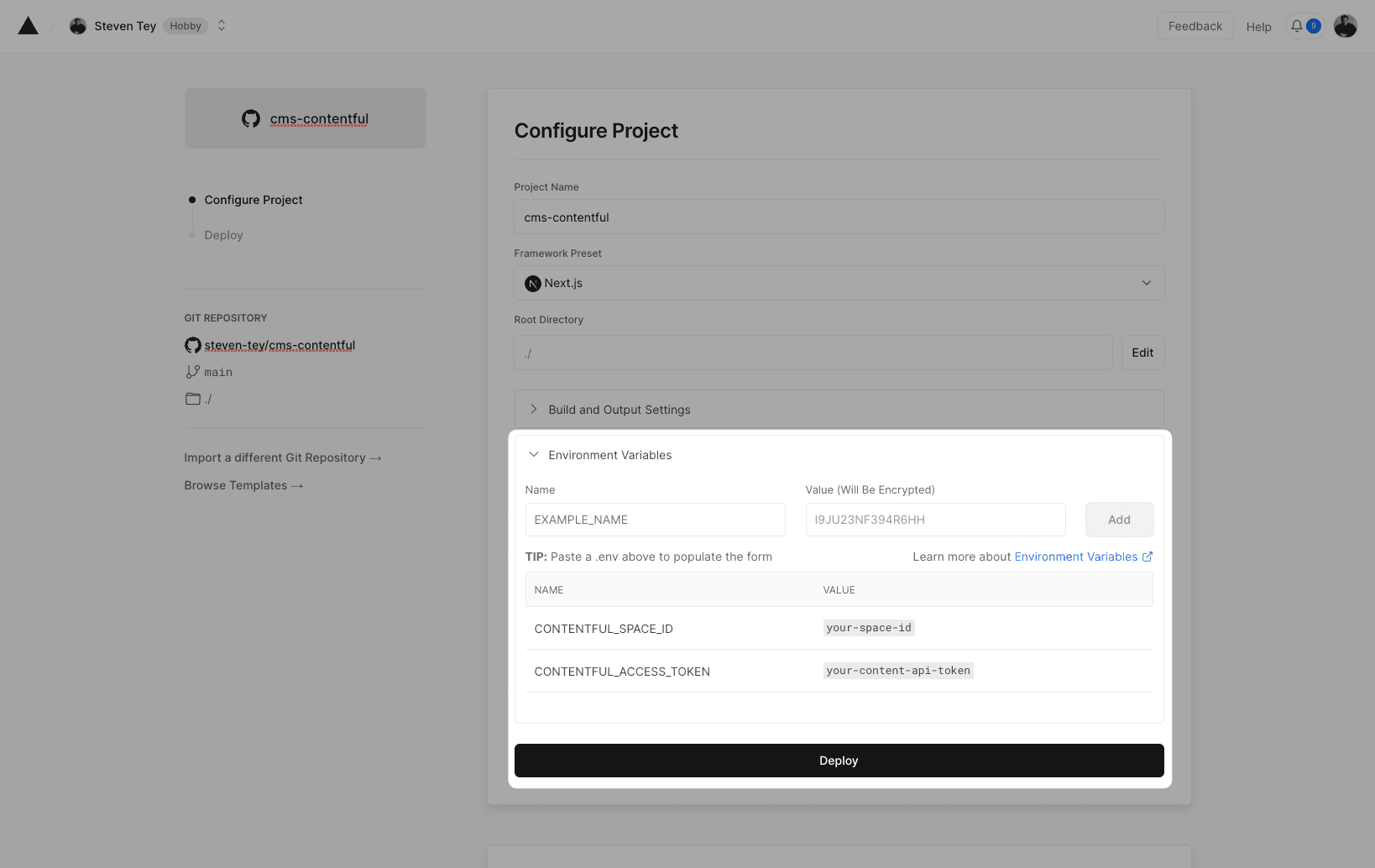 If you already have a Vercel deployment and a Contentful account, you should install the Contentful Integration to connect your Space to your Vercel project. To finish, the important parts that you need to know from the QuickStart are:
