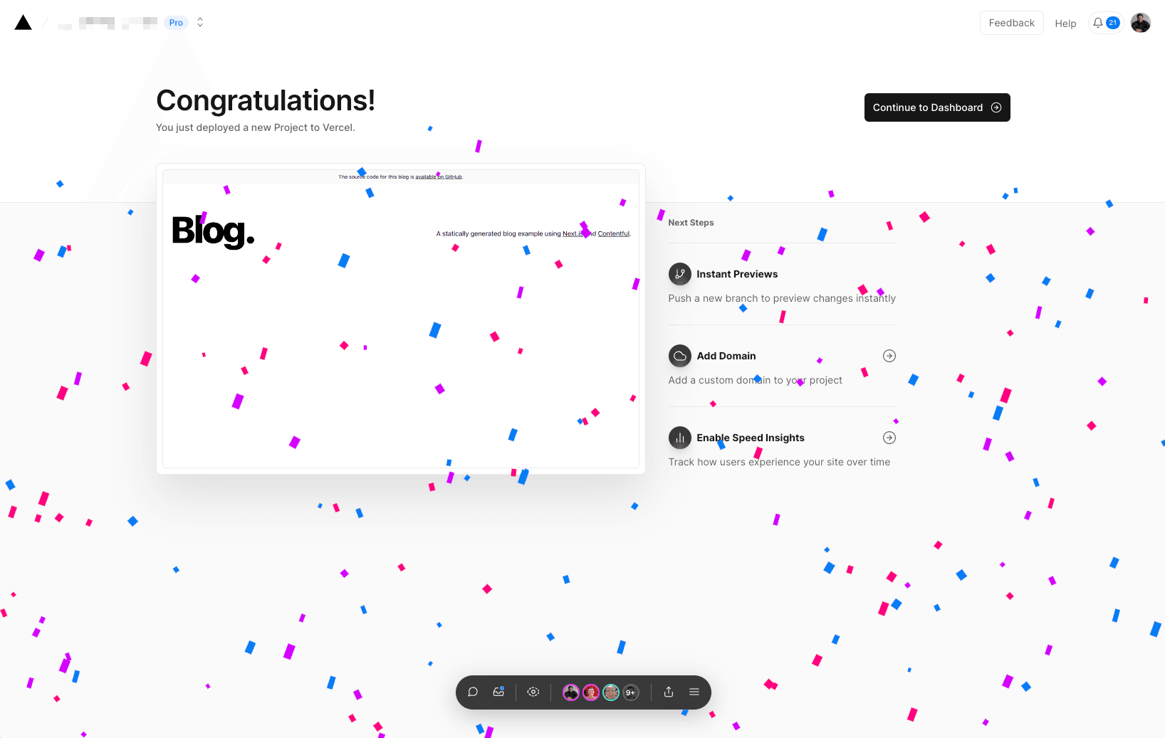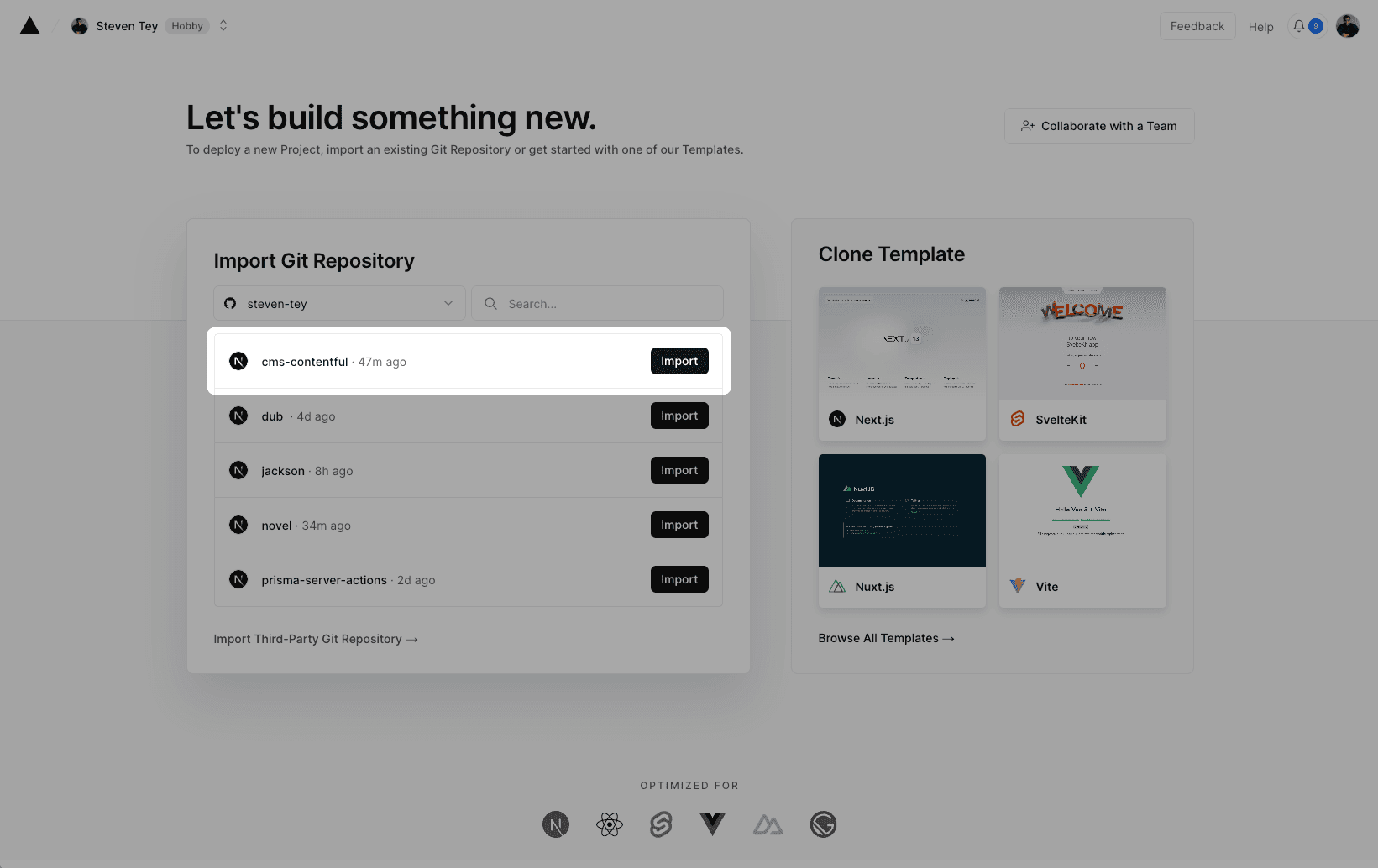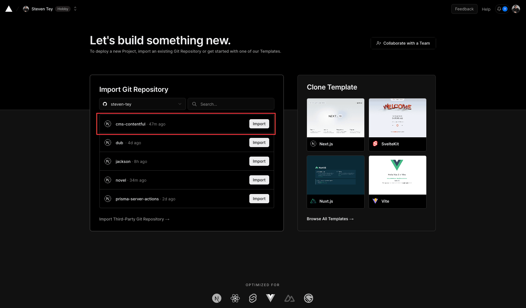 Now that you have your application wired up to Contentful, you can deploy it to Vercel to get your site online. You can either use the Vercel CLI or the Git integrations to deploy your code. Let’s use the Git integration.