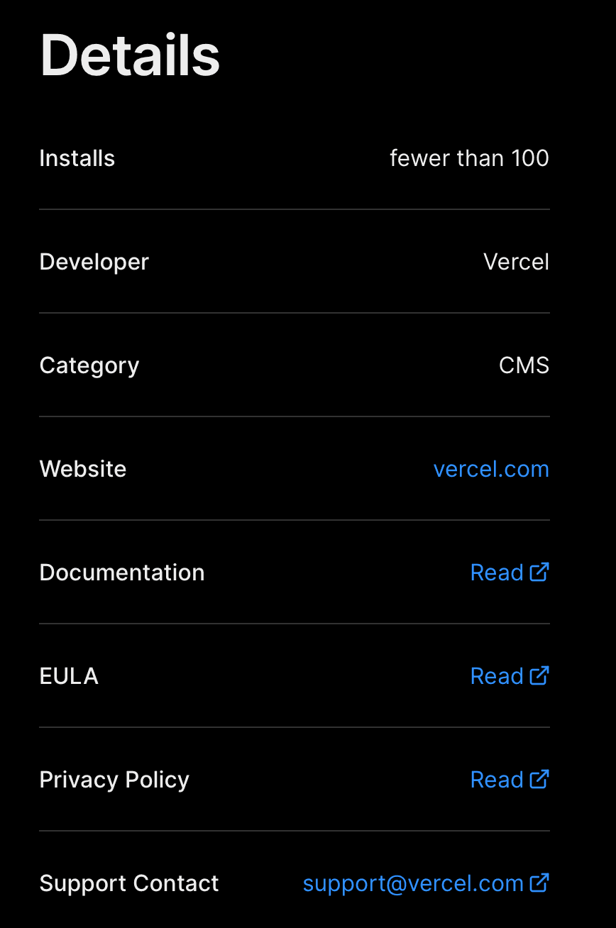They are displayed in the Details section of the Marketplace integration page that Vercel users view before they install the integration.