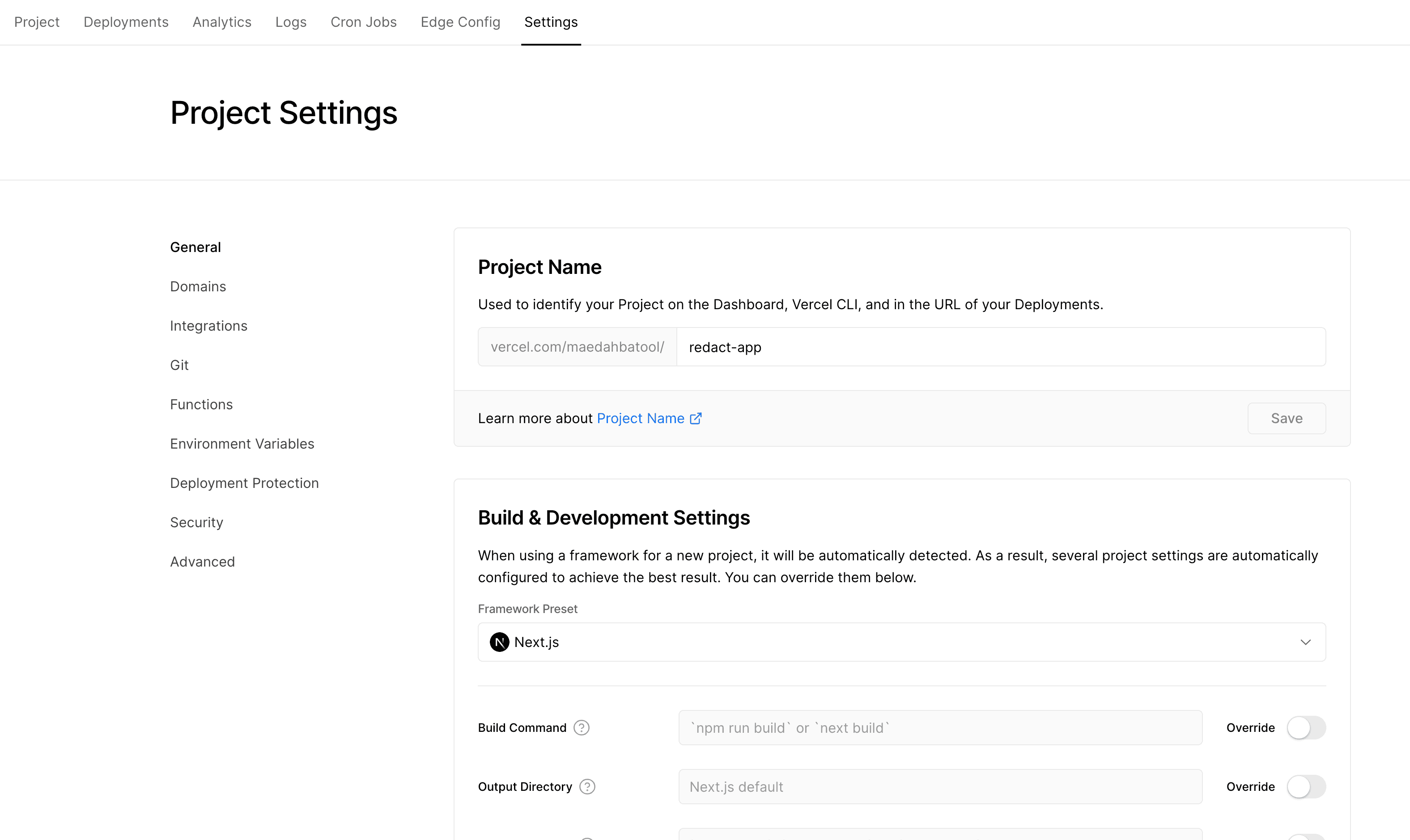 The Settings tab lets you configure your project. You can change the project's name, specify its root directory, configure environment variables and more directly in the dashboard.