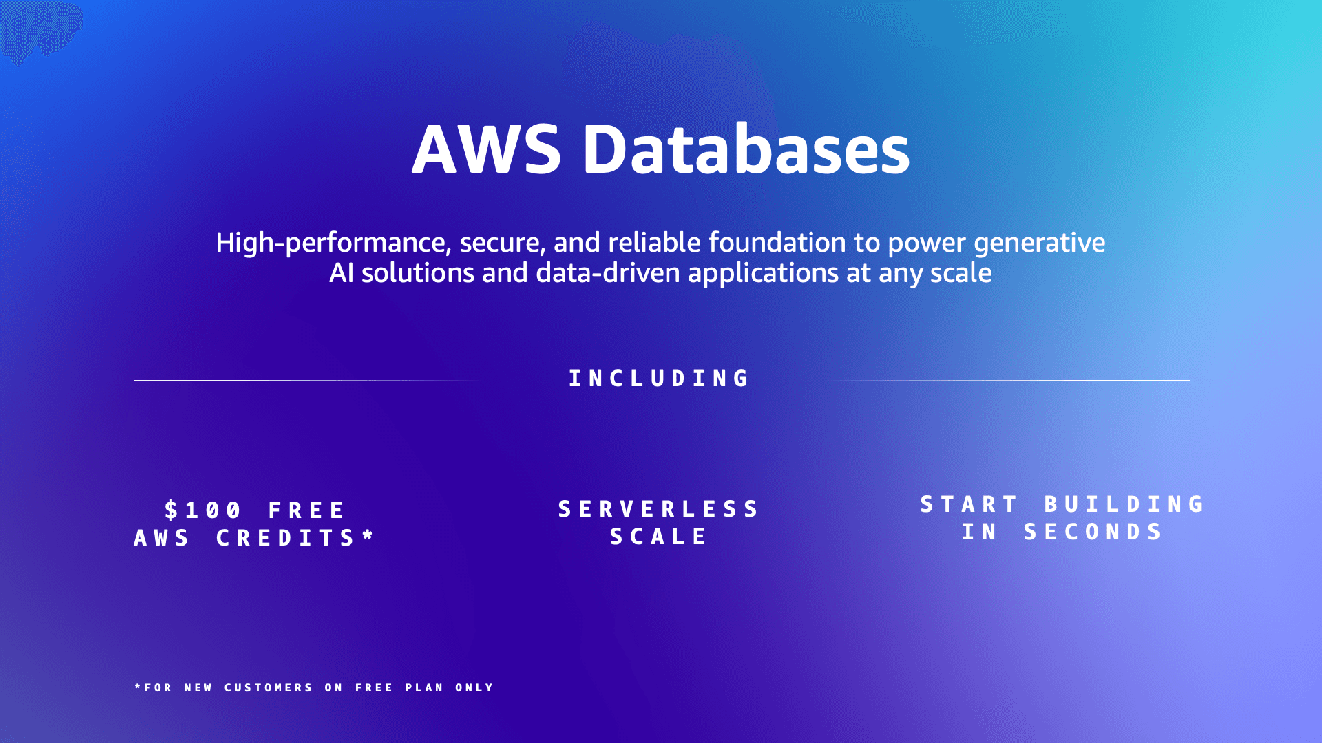 Build at the speed of an idea with AWS Databases. Create a new database in seconds and add features on-demand as your application grows. Focus on coding, not infrastructure management—our serverless, fully managed PostgreSQL and NoSQL databases automatically scale with your workload while you only pay for what you use. Whether you're prototyping your next big idea or powering production AI and data-driven applications, AWS Databases deliver the security, reliability, and price performance you need without the operational overhead.