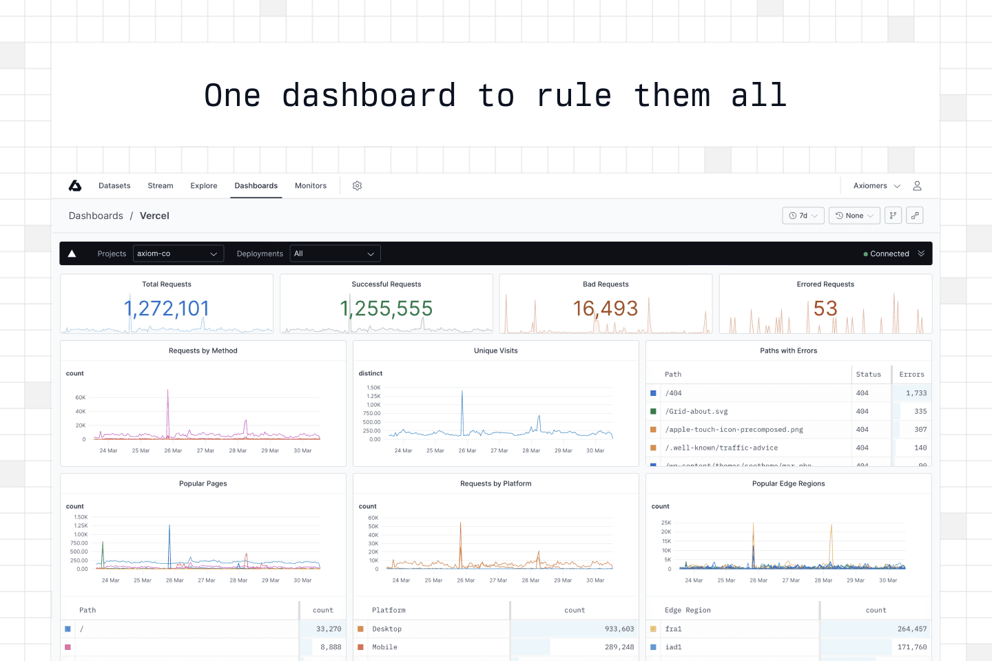 Axiom's Vercel integration enables you to monitor the health and performance of your Vercel deployments by ingesting all your request, function, and web vitals data.