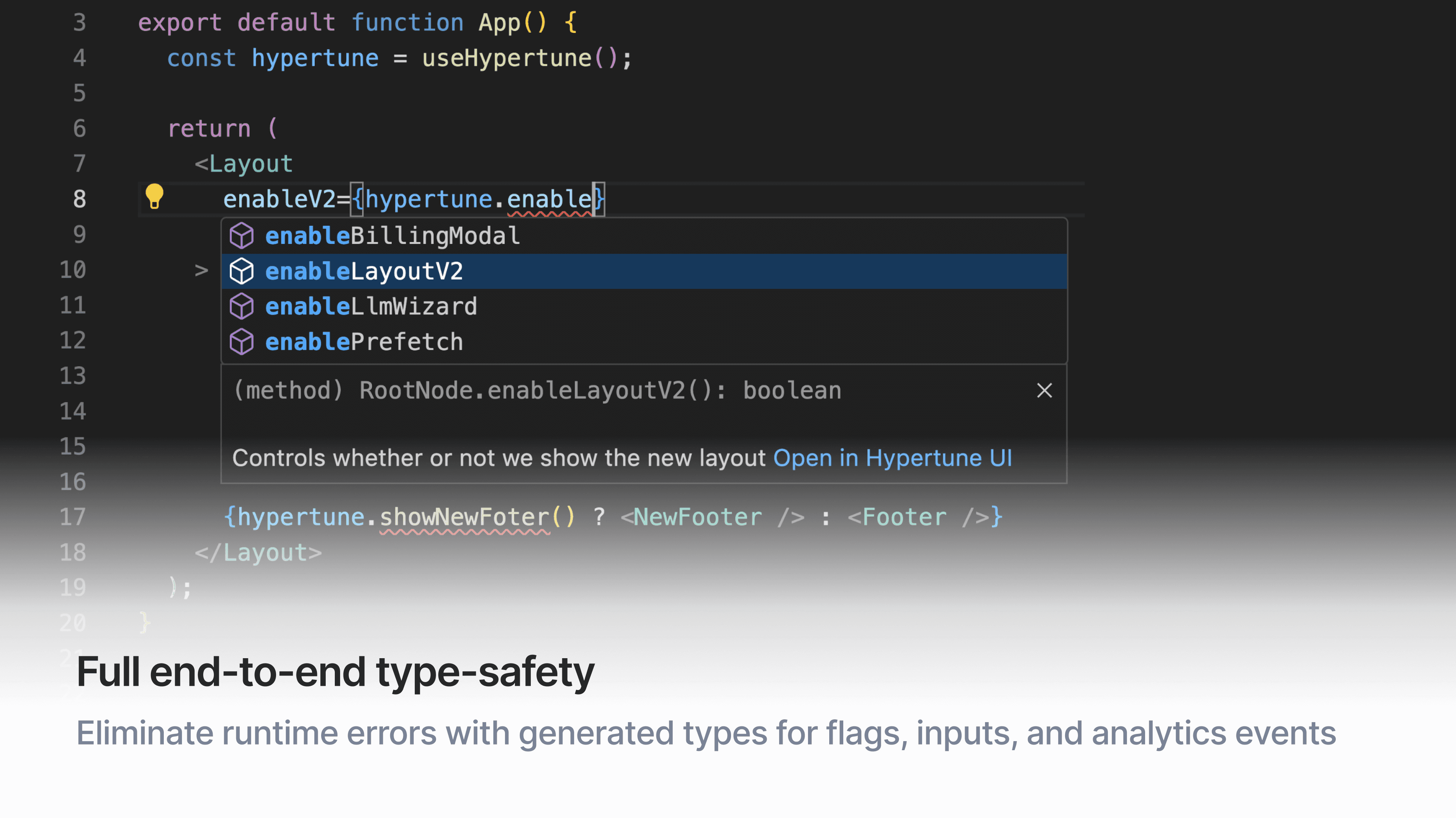 • Type-safe — Generated types for flags, inputs, and analytics events eliminate runtime errors and enable safe refactoring.