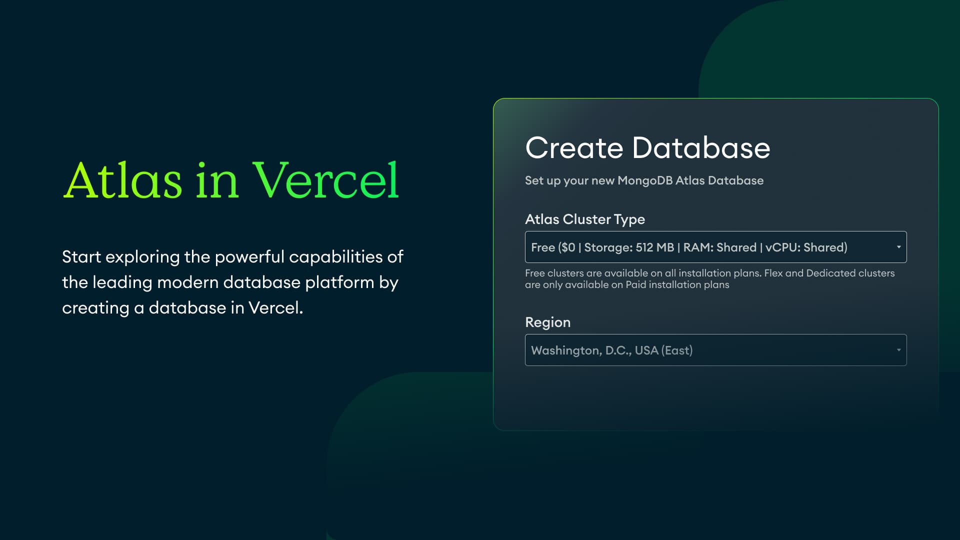 Get started with Vercel and MongoDB Atlas, the world’s leading modern, multi-cloud database. Atlas combines the flexible document model with a suite of data services to give you a versatile cloud database that simplifies everything you build. Build your next project with MongoDB Atlas’ AI-ready architecture, which comes with native support for vector search, full-text search, hybrid search, and real-time operational queries.