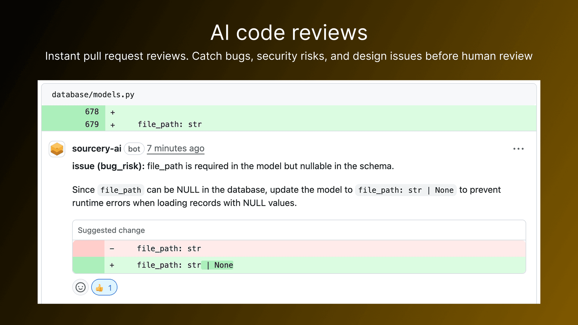 Sourcery reviews your code to reduce bugs and security risks, keeping it clean so you can move quickly.