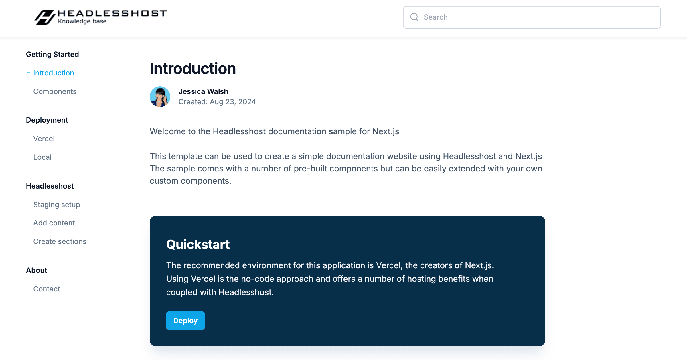 The Headelesshost knowledgebase template can be used to create a simple documentation website using Headlesshost and Next.js.